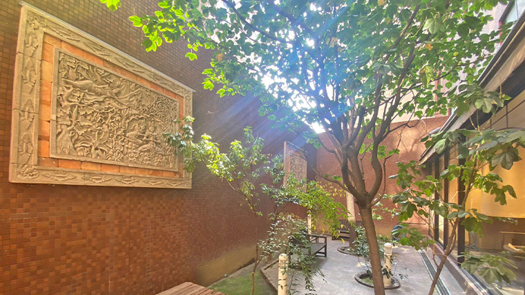 1階の正面扉を開くと、広びろとしたロビーと、その向こうにラウンジがあり、そこからは、中庭の風情あるたたずまいが眺められます。